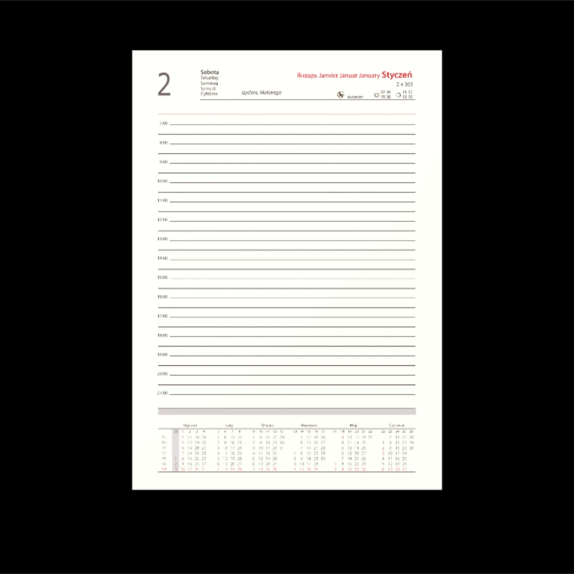| Układ: | 1 dzień na 1 stronie, sobota i niedziala osobno na całej stronie, przed każdym miesiącem terminarz miesięczny |